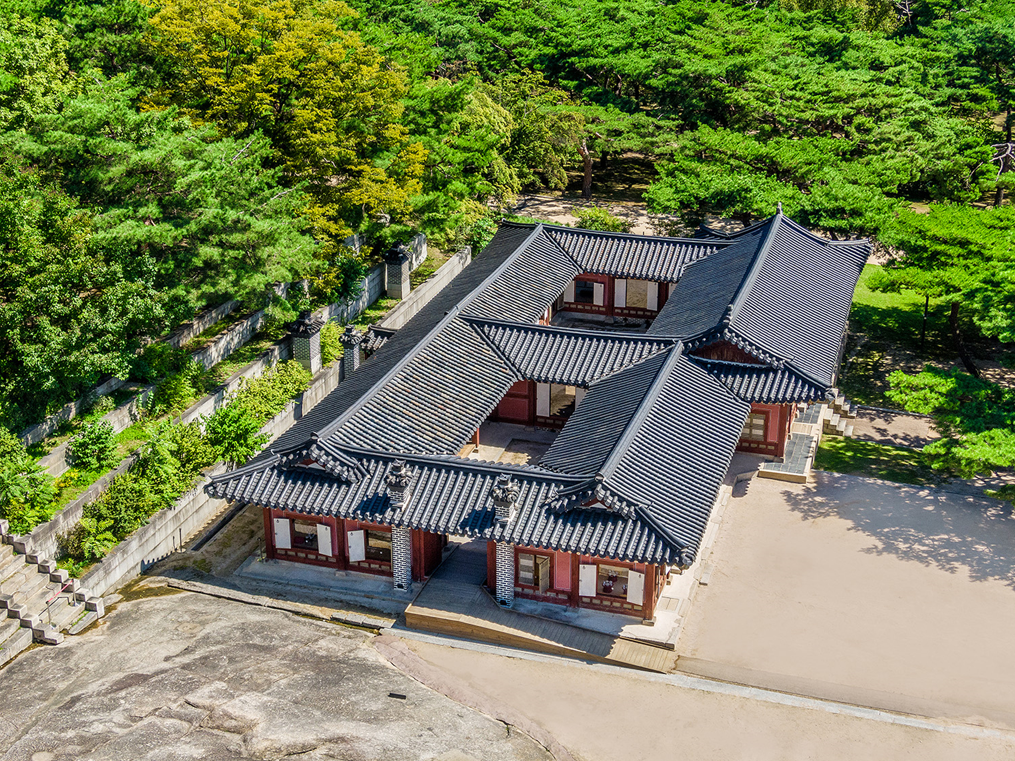 - 앞마당 석계: 건물 전경 + 석계 + 하늘을 함께 담는 광각 구도.