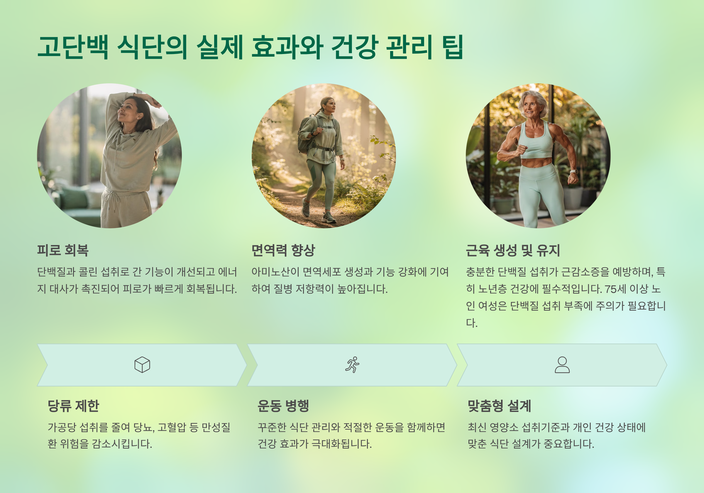 고단백 식단은 근육 유지 및 형성, 면역력 강화, 다이어트 시 포만감 유지에도 큰 도움을 줍니다. 또한 체력이 급격히 떨어지는 시기(계절 환절기, 과로 후 등)에 더욱 필요한 영양소입니다.