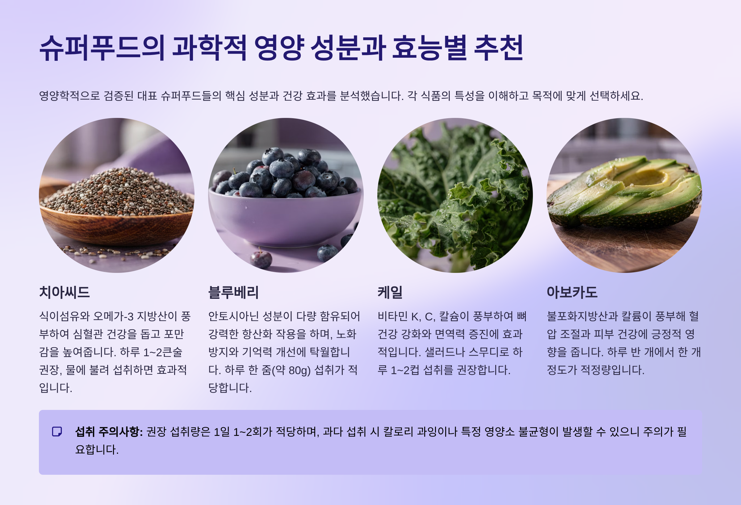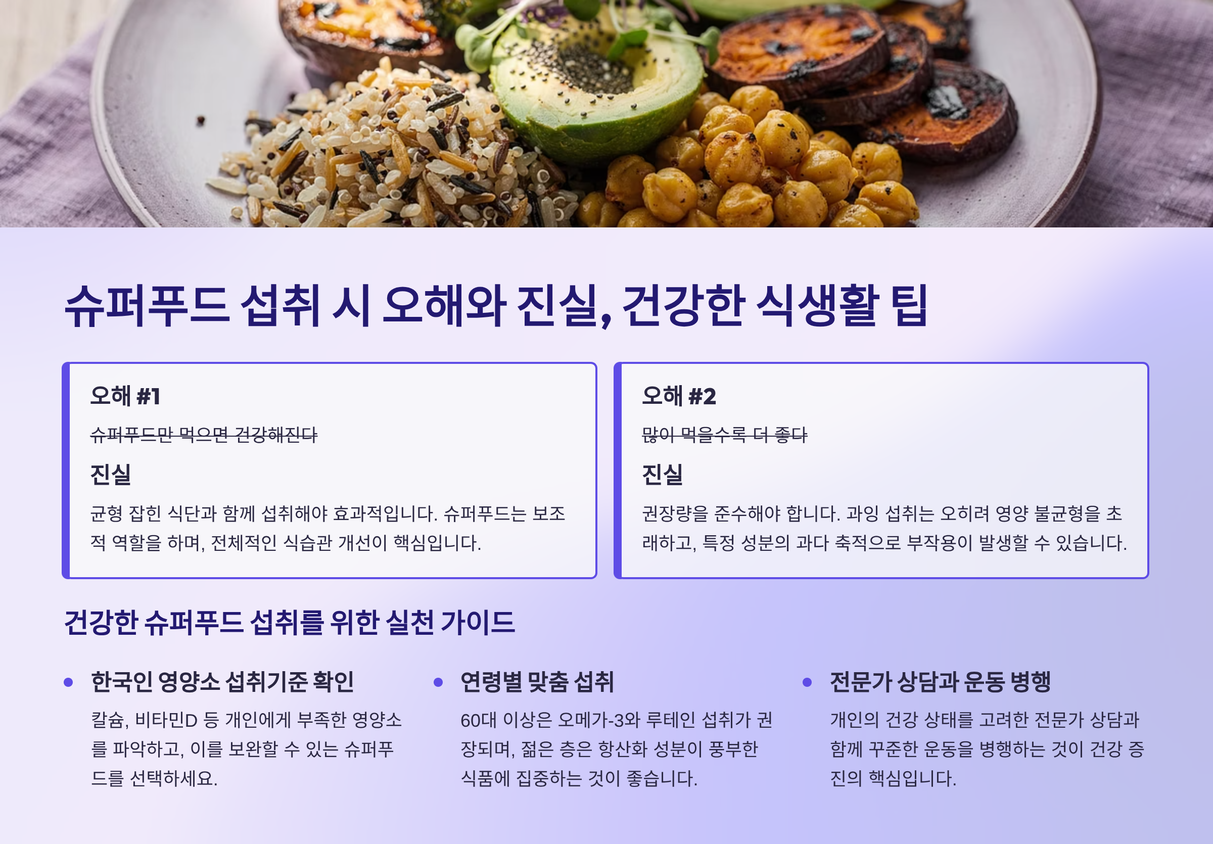 또한 슈퍼푸드는 어디까지나 '보조 식품'이라는 점을 기억하세요. 일상 식단에서 채소, 과일, 통곡물, 단백질 식품이 빠지면 안 되며, 슈퍼푸드는 그런 기본 식단을 보완하는 용도로 사용해야 건강 효과가 극대화됩니다.