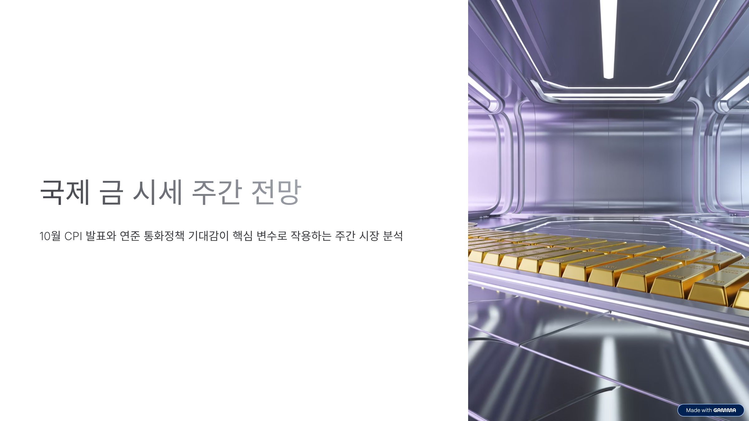 이번 주 금가격은 미국 10월 CPI(현지 11월 13일 발표 예정), 연준의 12월 회의에 대한 금리 인하 확률 변화, 달러 및 미 국채금리에 좌우될 가능성이 큽니다. 중국·유럽의 제조업/무역 지표, 지정학 이슈(원자재·교역·제재 이슈)도 변동성을 키울 수 있습니다.