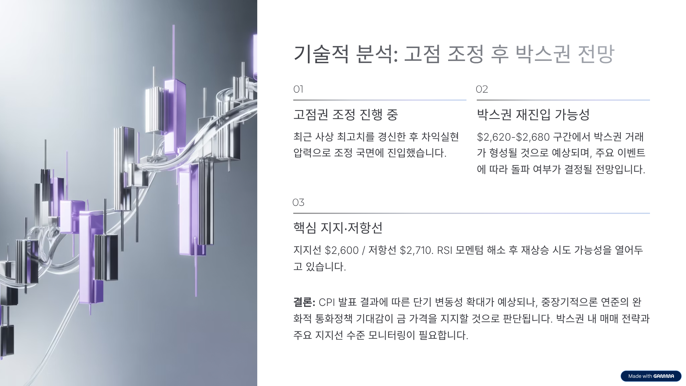 - CPI 둔화·달러 약세: 금리 인하 기대 재점화 → 상단 돌파 시 추세 추종 유리