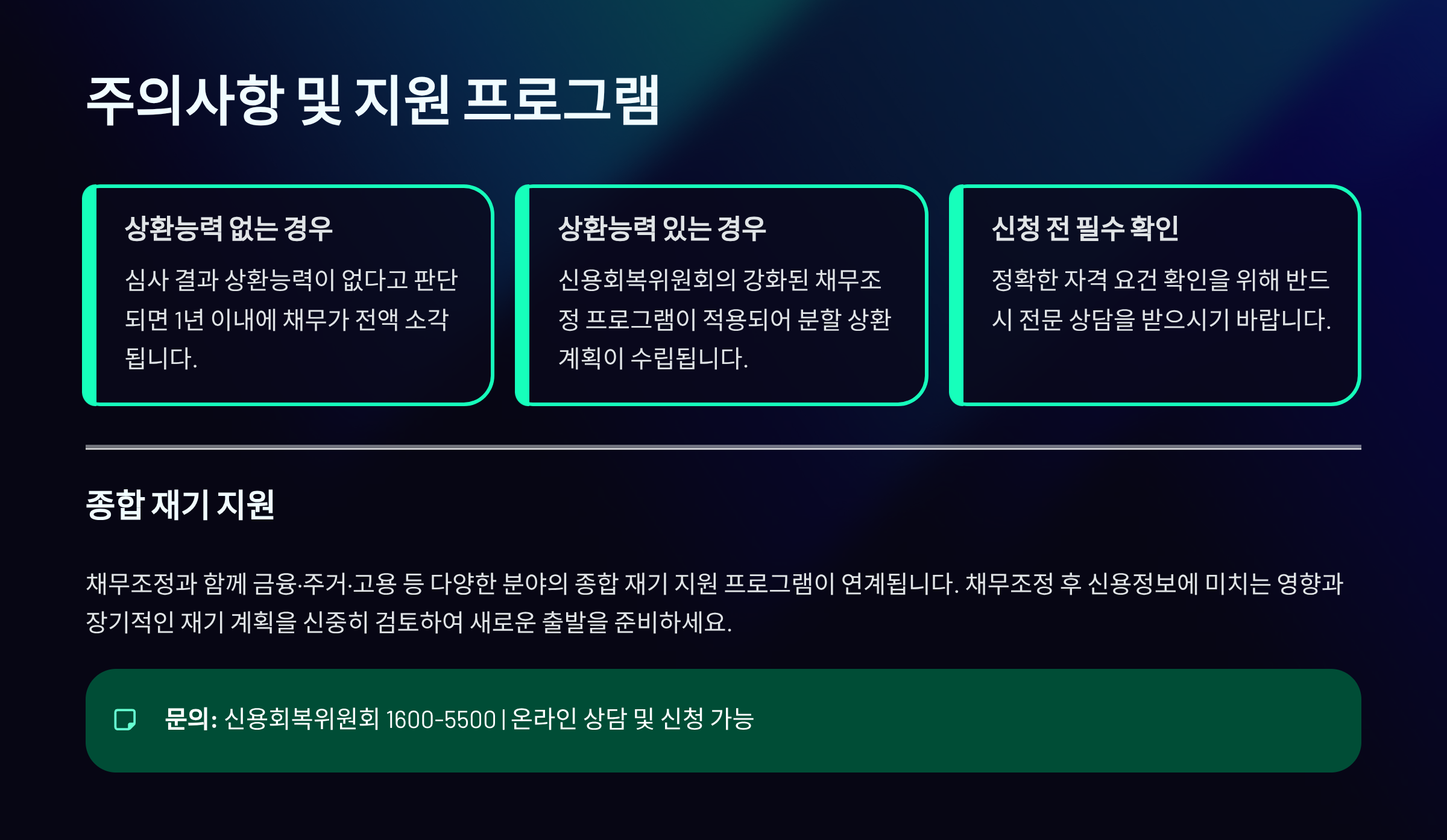 - 중복 지원 확인: 기존 채무조정 프로그램과 중복 시 일부 제한