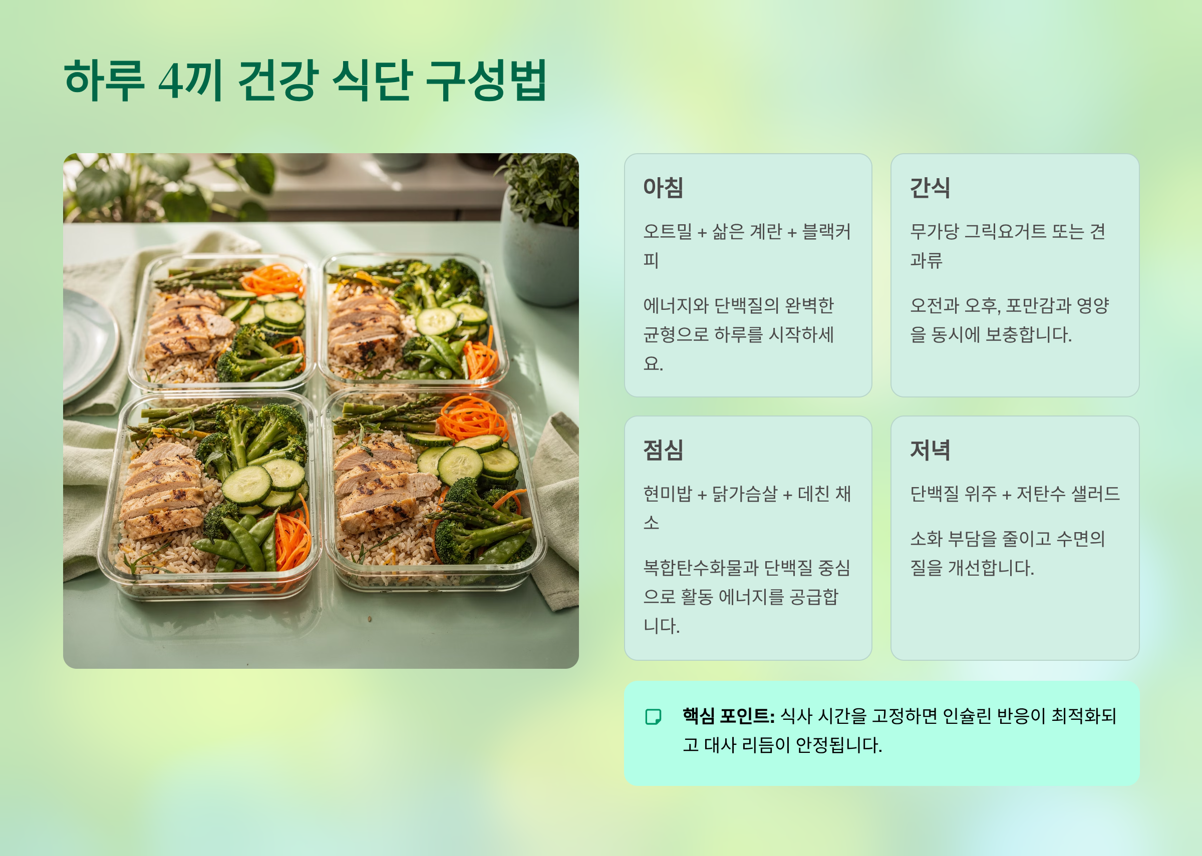 - 수분 섭취: 아침 기상 직후 물 1컵, 식사 중 따뜻한 차 추천