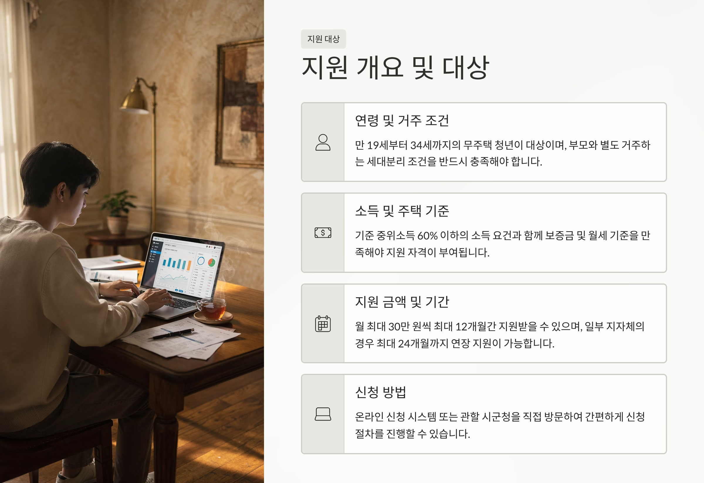 • 주거형태: 임차보증금 5천만 원 이하, 월세 60만 원 이하 주택 거주