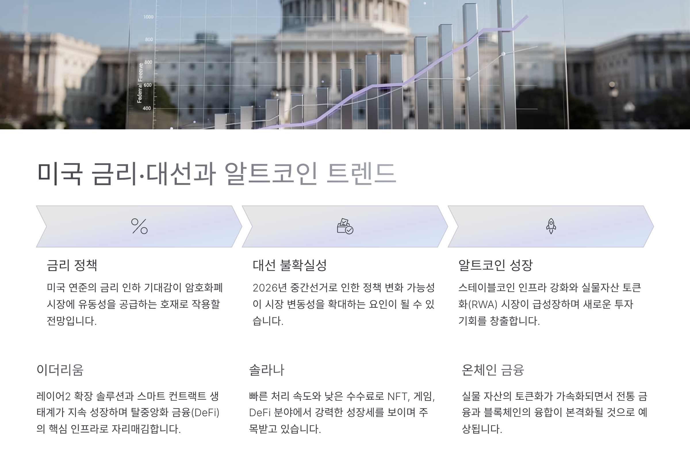 연준(Fed)의 금리 인하 가능성은 2026년 상반기 암호화폐 시장에 매우 중요한 변수입니다. 고금리 기조가 완화되면, 암호화폐를 포함한 위험자산 선호도가 다시 높아질 수 있습니다. 특히 '리스크 온' 심리가 부활하면 비트코인 및 주요 알트코인에 긍정적인 영향을 줄 수 있습니다.