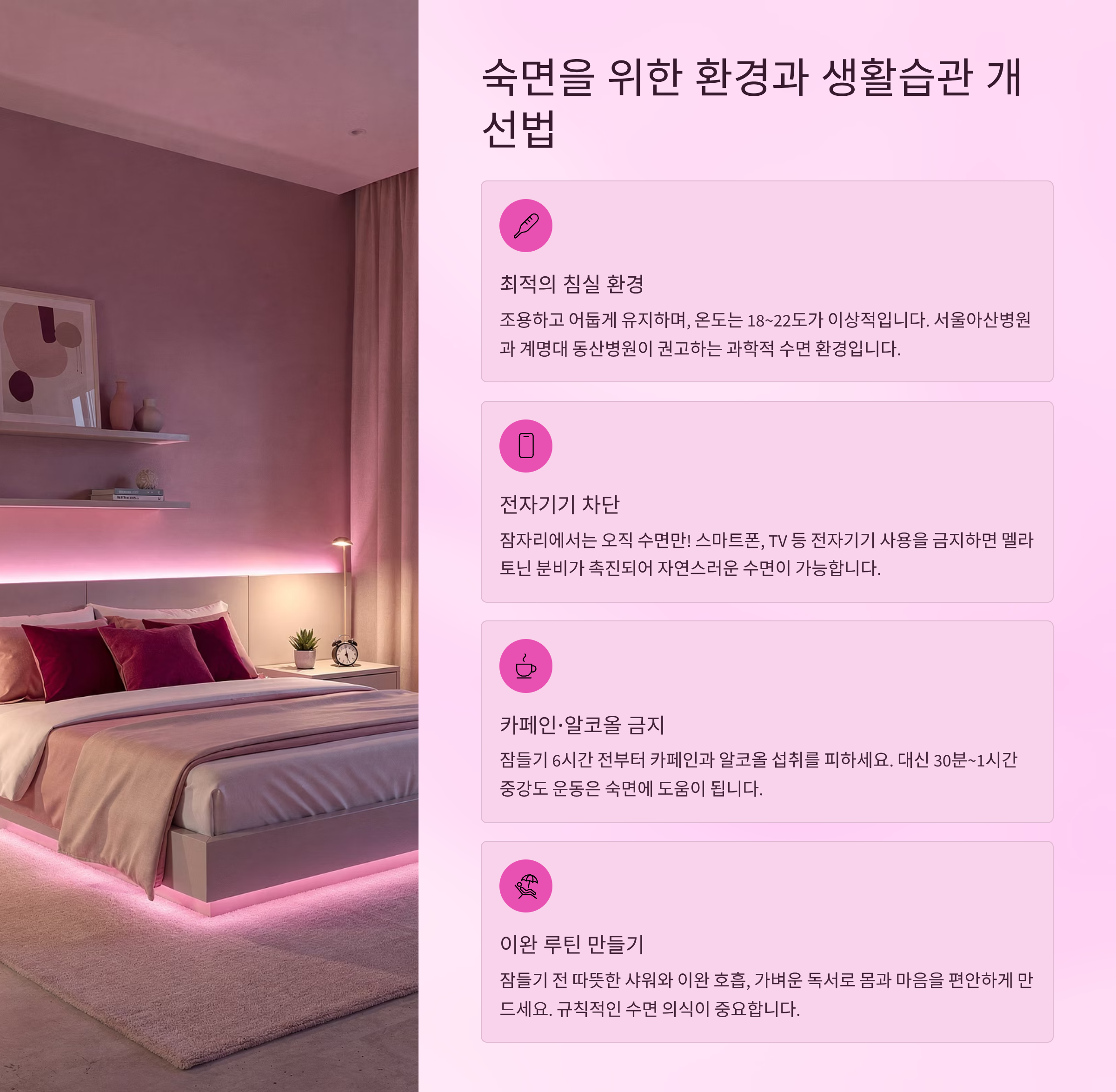 오늘부터 수면 습관 하나만 바꿔도 삶의 질이 달라집니다. 지금 내 방을 점검해보세요!